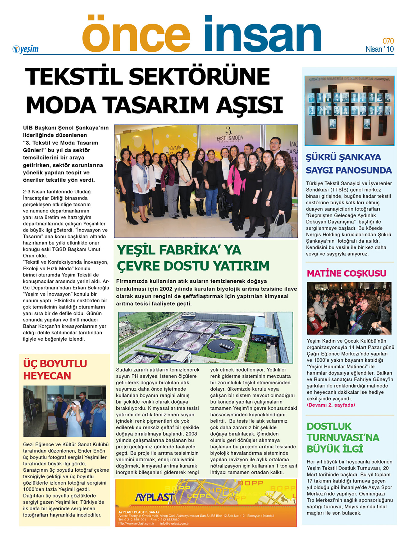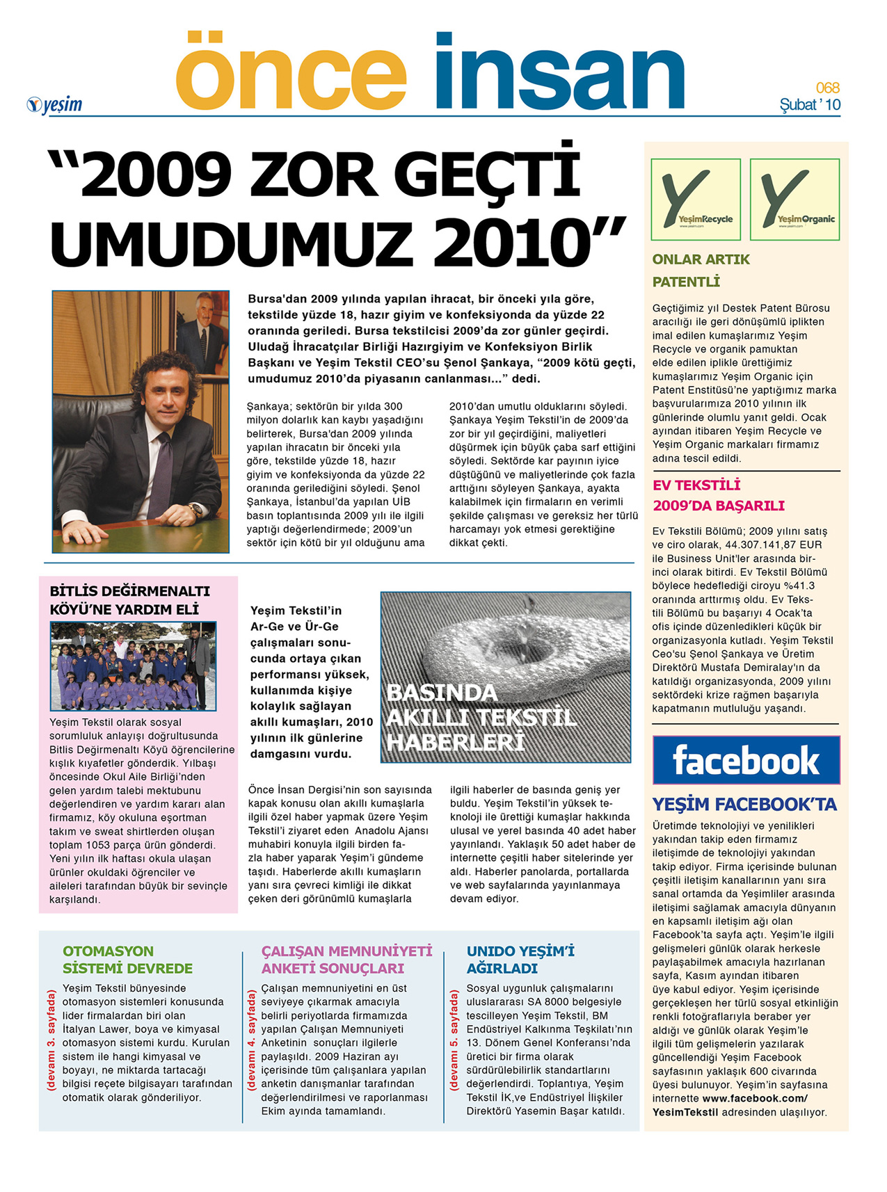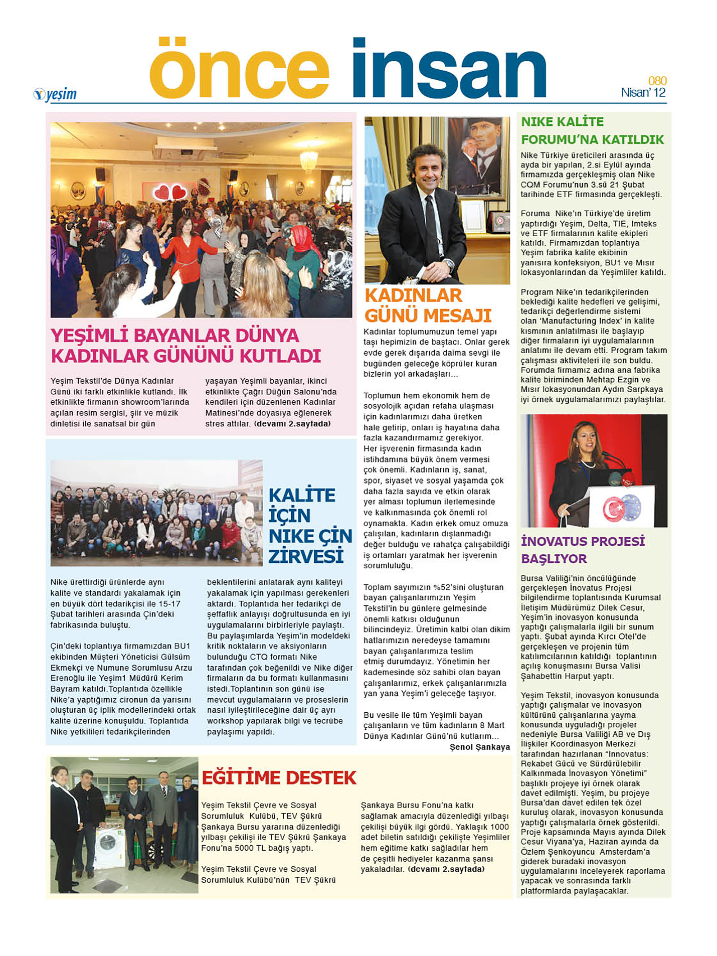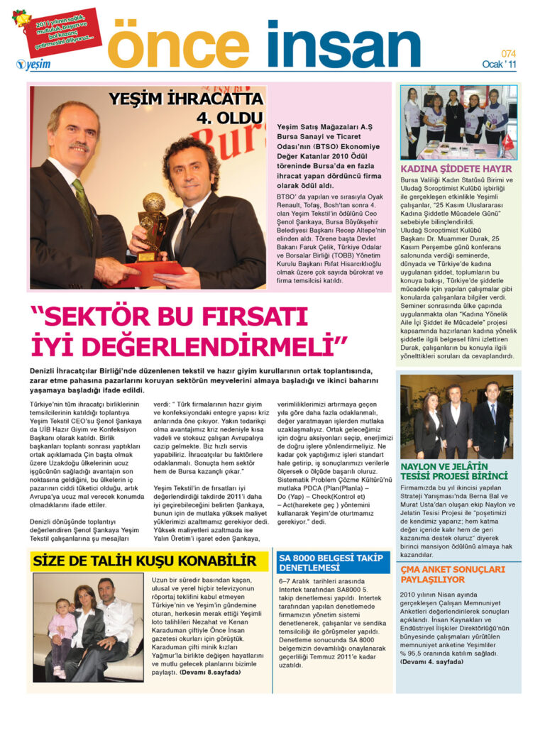 Yeşim Tekstil’in çalışanları için hazırladığı Önce İnsan Gazetesi, kurum içinden haberlerin, etkinliklerin, firma ile ilgili son gelişmelerin, röportajların, ödüllü yarışmaların bulunduğu içeriğiyle Yeşimliler arasındaki iletişim ve motivasyonu arttırmayı hedefliyor.